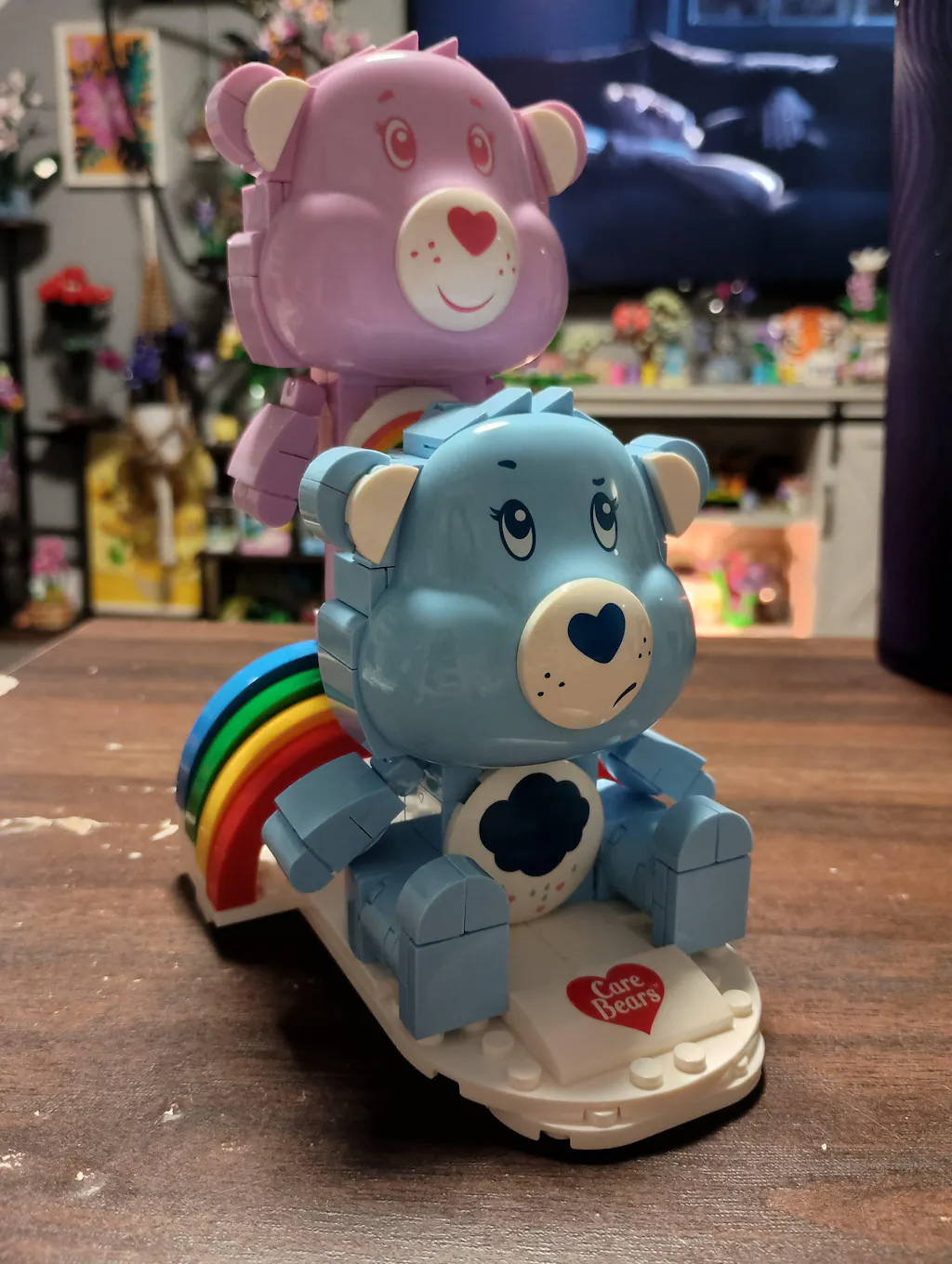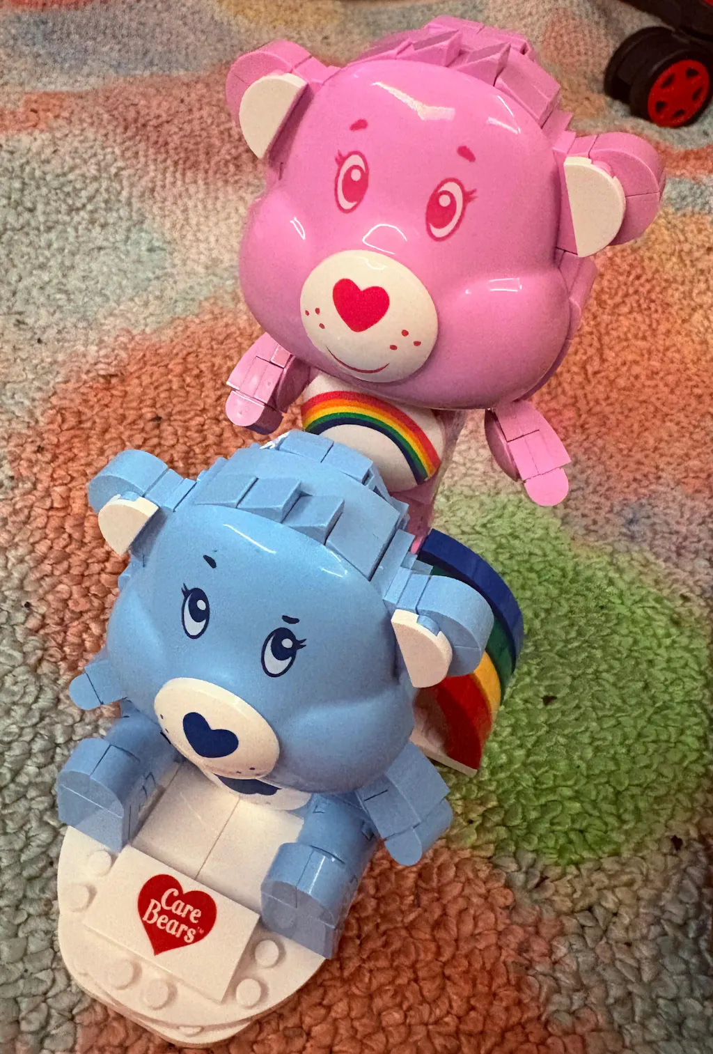 This charming Care Bears building set features the iconic Cheer Bear in soft pink, sitting atop a brick-built rainbow, and Grumpy Bear in baby blue, resting on the cloud-themed base. Both include printed belly badges, poseable arms, and a Care Bears logo on the front. The characters can also be removed from their bases, offering flexible display options. It's perfect for a memorable building activity or as a thoughtful gift that doubles as a fantastic display piece.