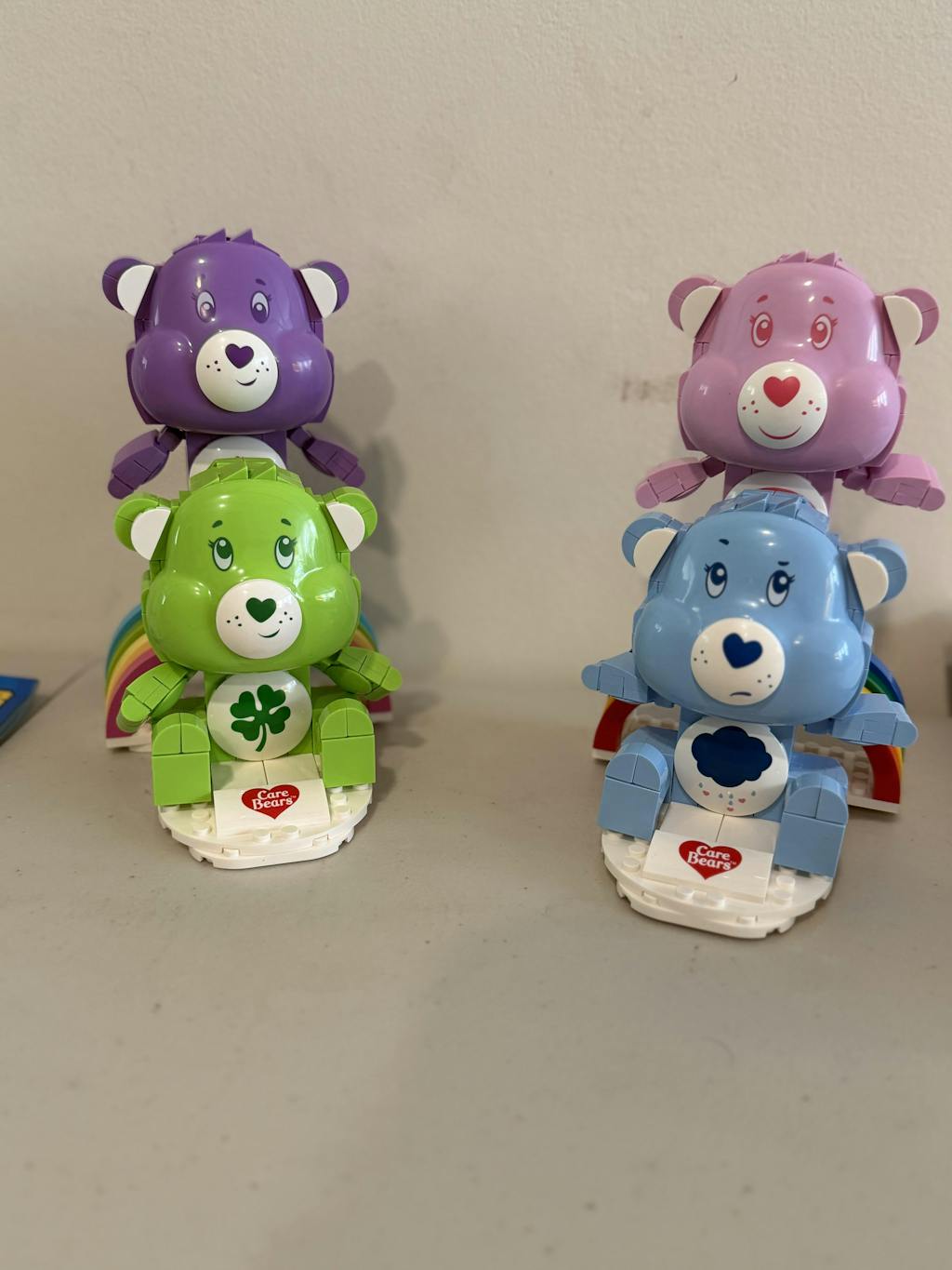 This charming Care Bears building set features the iconic Cheer Bear in soft pink, sitting atop a brick-built rainbow, and Grumpy Bear in baby blue, resting on the cloud-themed base. Both include printed belly badges, poseable arms, and a Care Bears logo on the front. The characters can also be removed from their bases, offering flexible display options. It's perfect for a memorable building activity or as a thoughtful gift that doubles as a fantastic display piece.