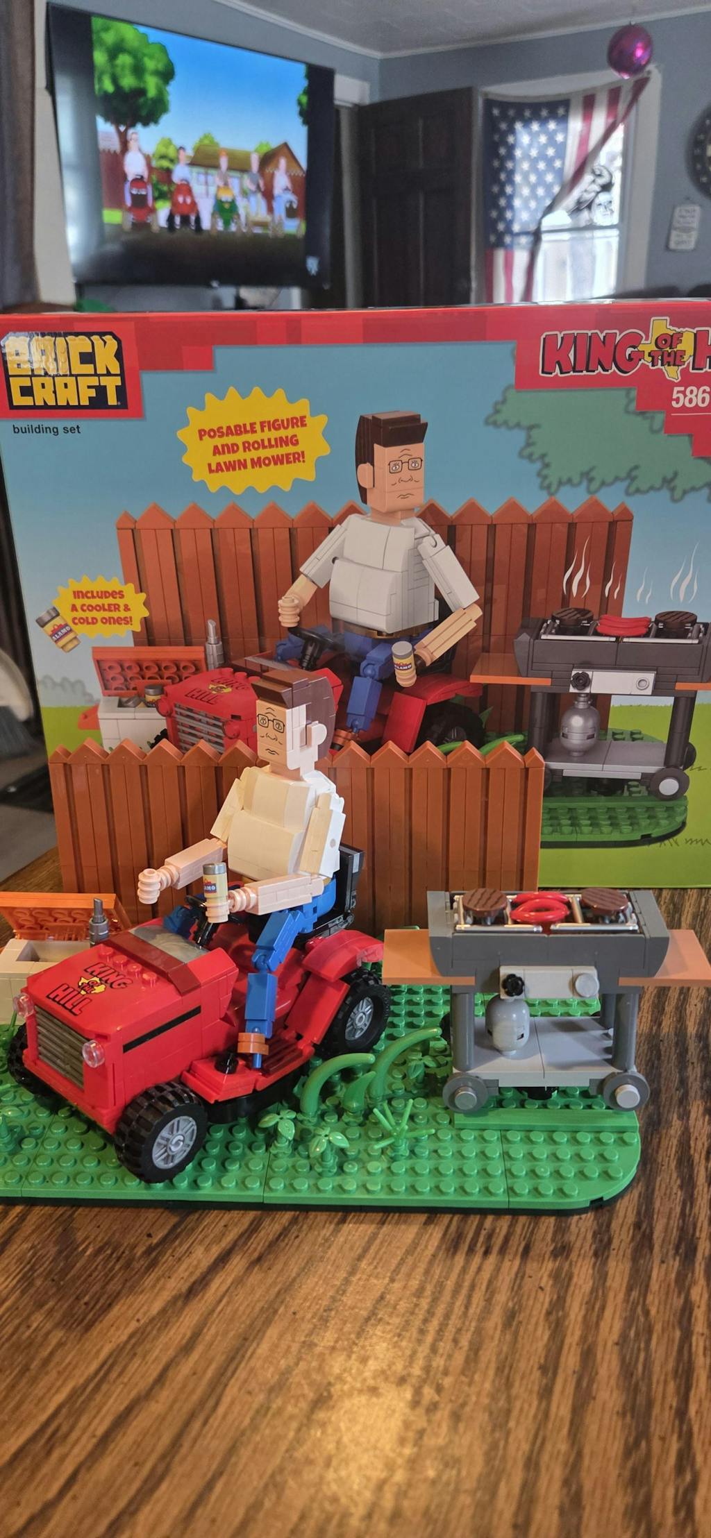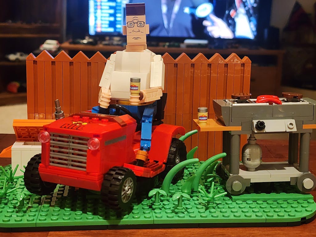 Bring Arlen, Texas, to life with this brick-built backyard scene featuring Hank Hill, his rolling lawn mower, and propane grill. The set includes a posable Hank figure, a cooler filled with Alamo cold ones, and a backyard base with fence details for suburban charm. With interactive play features and nostalgic details, this build captures the humor and everyday pride of King of the Hill.