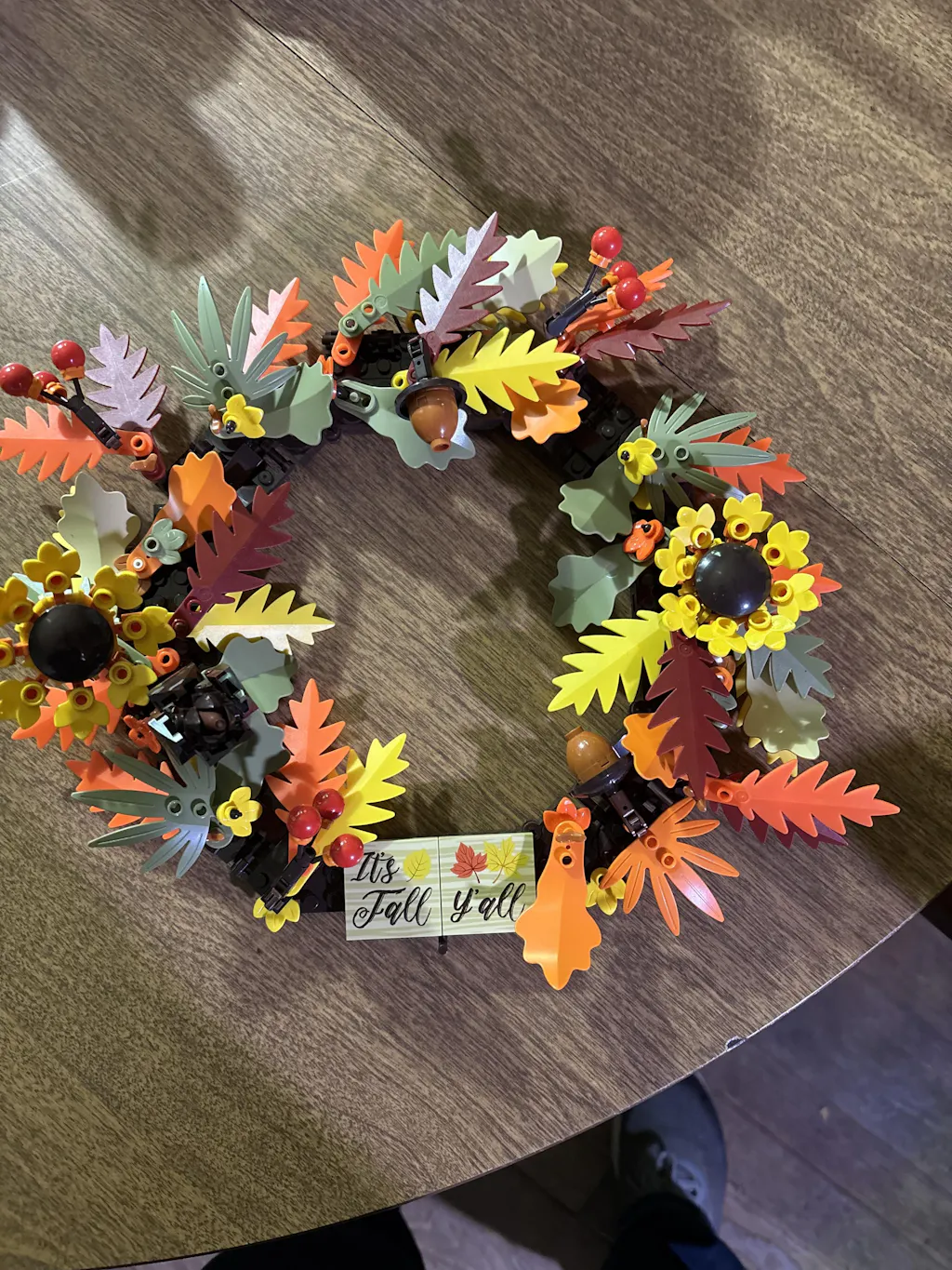 This cozy 2-in-1 build features an autumn-inspired wreath that can be rebuilt into a festive garland. With acorns, berries, sunflowers, and colorful leaves, it’s a charming seasonal display for any space. A printed “It’s Fall Y’all” sign and included string make it easy to hang or showcase on a table, shelf, or mantle - no watering required.