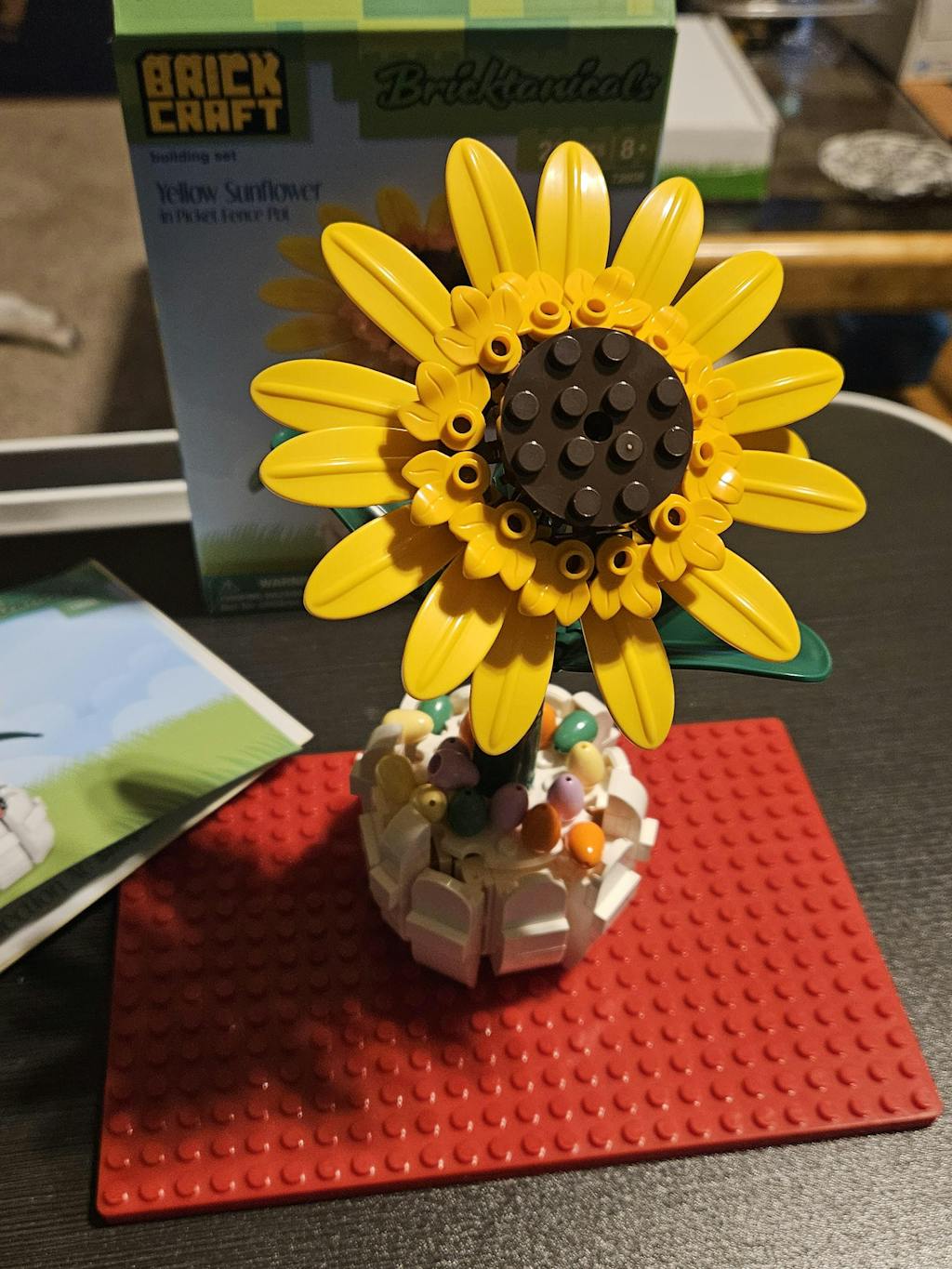 Golden petals, rich brown center, and all the warmth of a summer afternoon - this classic sunflower brings instant sunshine to any space. Rising from a white picket fence pot with colorful Easter eggs at the base, this botanical build captures everything you love about the real thing. Green leaves frame the bloom, and the best part? No watering, no wilting, just bright vibes year-round.